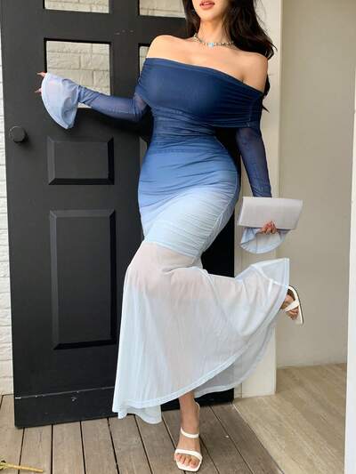 Women's Elegant Ombre Off-Shoulder Flare Sleeve Mermaid Dress-35%