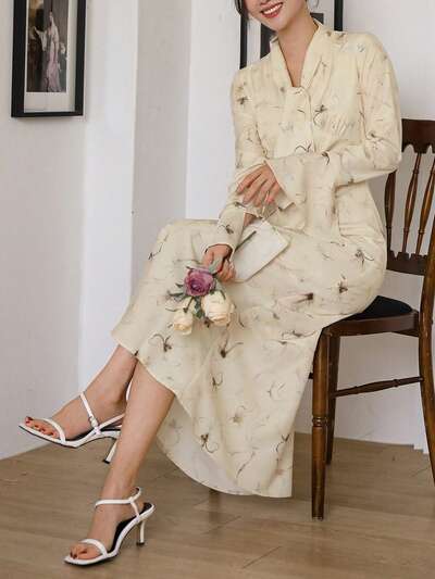 Women's Floral Print Long Sleeve Dress With Tie Waist, Spring/Fall-60%
