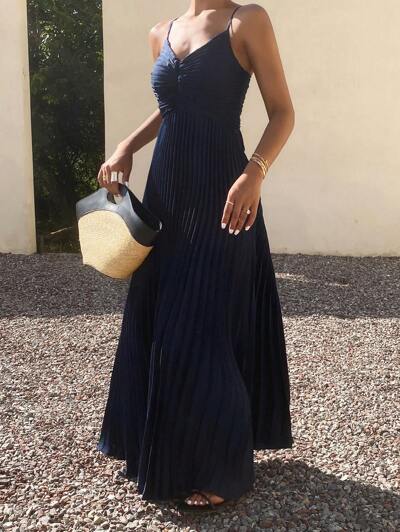 Women's Solid Color Spaghetti Strap Pleated Long Dress, Fashion, Casual Women Dresses Vacation Dress Cruise Outfit For Women-23%
