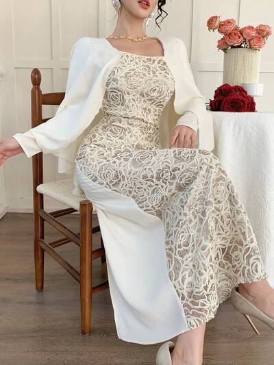 Spring & Summer 2 In 1 Floral Lace Print Elegant Maxi Dress, Suitable For Valentine's Day, Wedding, Party, Formal Occasion, Slim Fit, Sheer Chiffon Overlay Wedding Guest Dress Sundress-50%