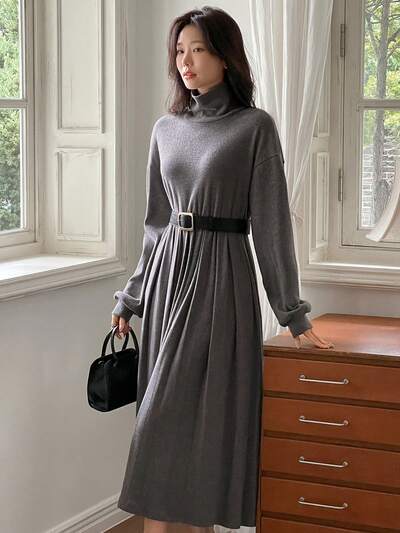 Women Long Pleated Dress (Without Belt),Fall Dress Long Sleeve Dress Maxi Dress-60%