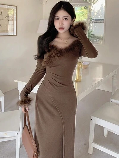 Women's Shirt With Furry Patchwork Long Sleeve Casual Long Dress,Fall Clothes-60%