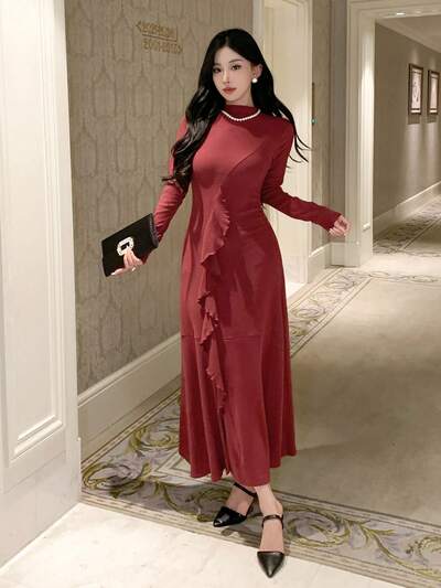 Women's Autumn Winter Ruffle Hem Midi Sheath Dress Prom Dress,Fall Women Clothes Long Sleeve Dress Red Women Dresses Christmas-65%
