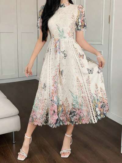 Women's Floral Print Mandarin Collar Short Sleeve Elegant Dress Sundress-73%
