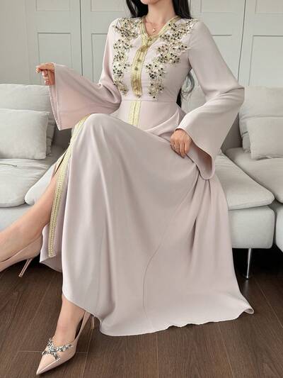 Women's Elegant Solid Color V-Neck Frill Trim Dress, Summer Wedding Guest Dress Maxi Dress Sundress