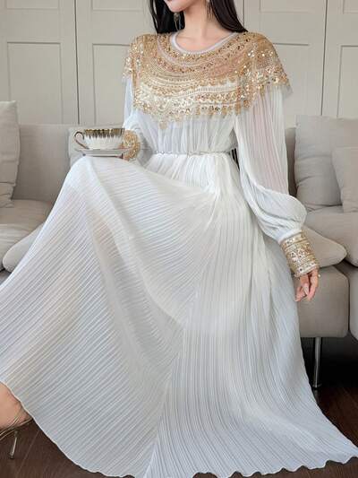French Elegant Sequin Embroidered Mesh Patchwork Waist Pleated Dress For Women Sparkly Dress Maxi Dress Sundress-42%
