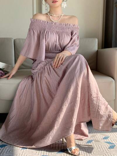 Women's Summer Off Shoulder Short Sleeve Waist Cinched Elegant Long Dress Sundress-67%