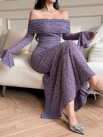 Women's Elegant Solid Color Lace Off-Shoulder Flare Sleeve Long Dress, Spring/Summer Easter-23%