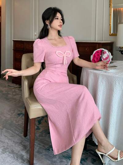 Women's Casual V-Neck Puff Sleeve Bowknot Decor Mid-Length Dress Summer