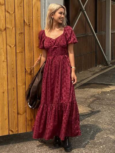 Women Hollow Out Square Neck Waist-Cinched Mid-Length Dress,Ruffle Red Women Dresses Maxi Dress-50%