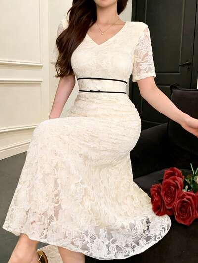 Women's Elegant Contrast Color Lace V-Neck Long Dress, Spring/Summer Wedding Guest Dress Sundress-42%