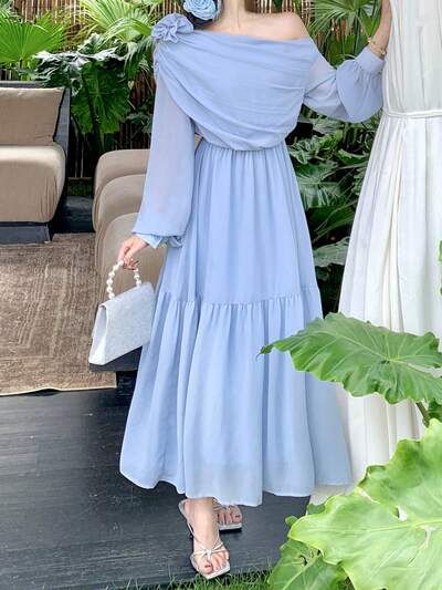Off-Shoulder Ruffle Hem Dress, Women's New Waist-Cinching Slimming Floral Chiffon Dress, Elegant Vacation Dress Summer Boho-70%
