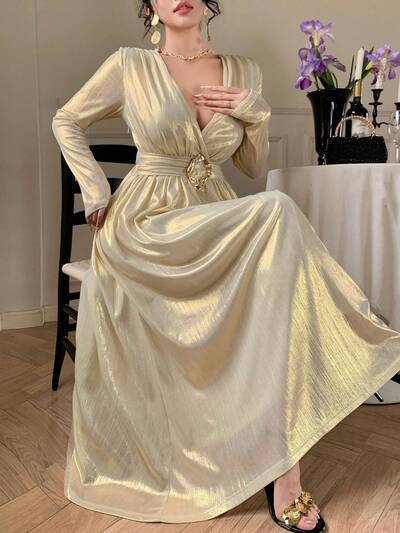 Women's Metallic Overlap V-Neck Long Sleeve Waist Metal Decor Elegant Dress Wedding Guest Dress Maxi Dress Sundress-23%
