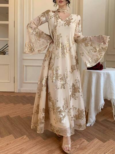 Spring/Summer Gold Sequin Ditsy Floral Lace Dress, Elegant For Valentine's Day, Wedding, Party, Formal Occasion, Fashion, Commute, Flared Sleeves, Waist Tie, Maxi Skirt, Long Sleeve Women Midi Dress Sundress-62%