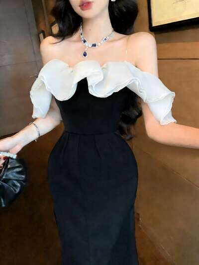 Elegant Dress For Women, Patchwork Color Block Ruffle Open Shoulder Cinched Waist, Suitable For Banquet In Spring And Autumn Sundress Off The Shoulder