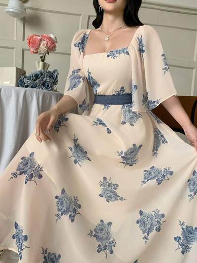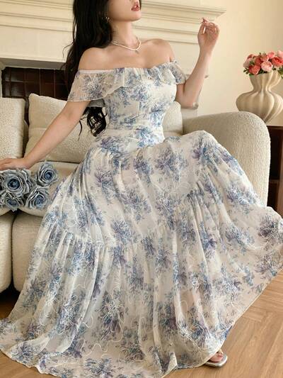 Women Summer Vacation Style Floral Printed Fish Tail Dress Sundress Maxi Dress Boho
