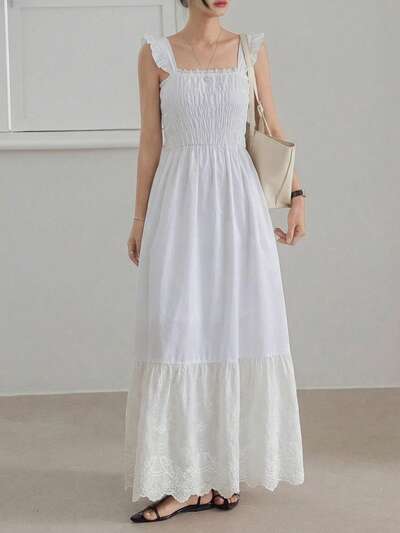 Spring/Summer Elegant Lace & Mesh Patchwork Midi Dress, Fitted Waist, Casual/Formal Occasion, Vacation, Commute Sundress-63%