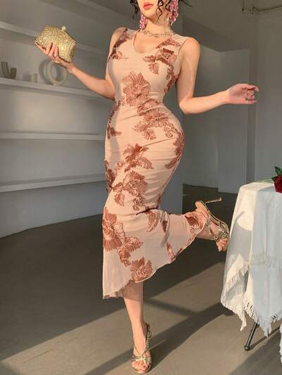 Women's Elegant Floral Textured V-Neck Sleeveless Dress, Summer Wedding Guest Dress Sundress-75%