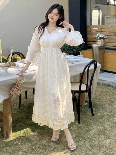 Lace V-Neckline Puff Sleeves Waist Cinched Long Short Sleeve Dress For Women Sundress-43%
