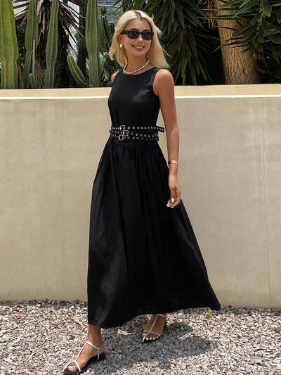 Women's Solid Color Round Neck Sleeveless A-Line Umbrella Skirt Dress, Waisted Casual Vacation Summer Long Dress Maxi Dress