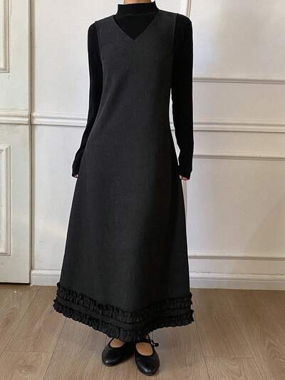 Women's Solid Color Fitted V-Neck Dress With Ruffle Hem, Elegant & Formal, Autumn/Winter Maxi Dress