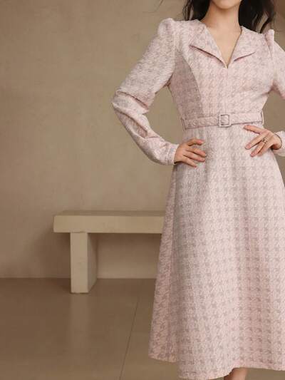 Spring/Summer Elegant Houndstooth Print Long Sleeve Midi Dress, Suitable For Valentine's Day, Wedding, Party, Formal Occasion, Commute Sundress