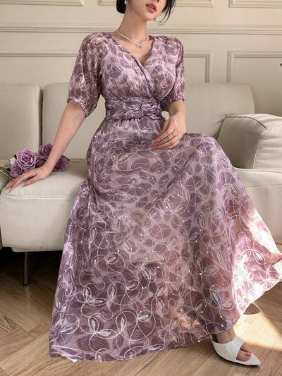Women's Elegant Mid-Length Floral Sequined Round Neck Short Sleeve Dress Prom Dress,Dress For Wedding New Year Eve Dress Maxi Dress