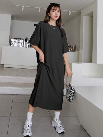 Solid Drop Shoulder Tee Dress Sundress-42%