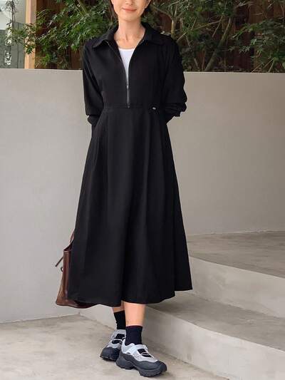 Women's Solid Color Zip-Up Half Placket Long Sleeve Dress, Spring/Fall