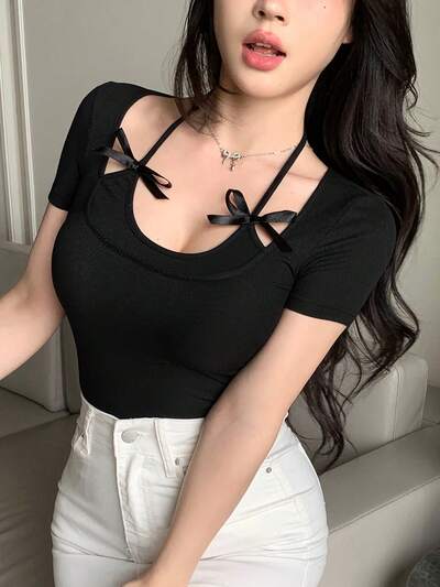 Women Crew Neck Knitted 2 In 1 Short Sleeve T-Shirt, Summer