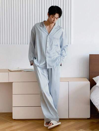 Blue Plaid Shirt Paired With Men's Loungewear Set, Autumn, Fall Clothes Pajama