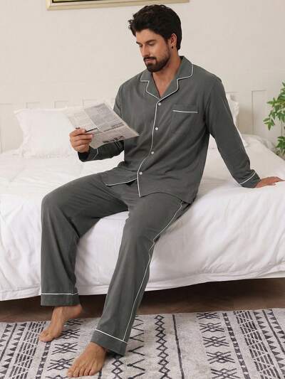 Spring/Autumn Men's Contrast Color Shirt & Gray Drawstring Pajama Set