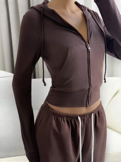 Women's Minimalist Solid Color Outdoor Zip-Up Drawstring Hooded Cropped Sports Jacket-50%