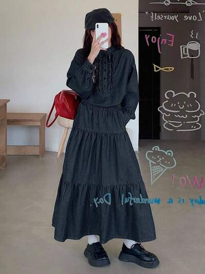 Women's Round Neck Half-Zip Frill Trim Denim Top And Long Denim Skirt Casual Denim Set-35%