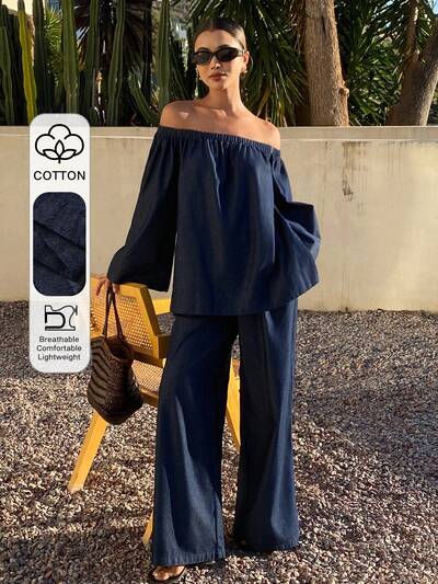 Women's Casual Off-Shoulder Top And Wide-Leg Jeans Set, Spring/Summer-25%