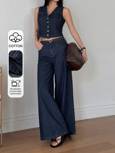 Women's V-Neck Sleeveless Cardigan And Loose Wide-Leg Jeans Casual Suit Summer-36%
