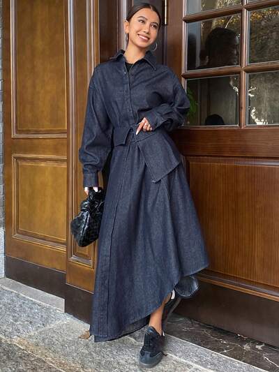 Women's Western Style Solid Color Loose Long Sleeve Turndown Collar Dress & Denim Skirt 2 Pieces Set,Fall Clothes-29%