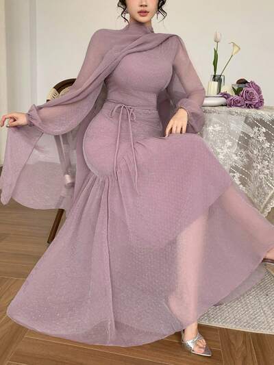Women's Elegant Solid Color Petal Sleeve Fishtail Dress With Headscarf, 2 Pieces Set, Spring/Summer