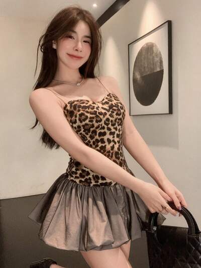 Leopard Allover Print Puff Skirt Strap Tank Tops Mesh Patchwork Dress Outfits For Women Summer Going Out Tops Tube Top-69%