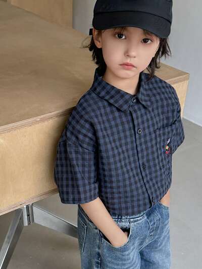 Young Boy Summer Casual Daily Commute School Style Cartoon Embroidery Patchwork Plaid Print Short Sleeve Shirt-75%