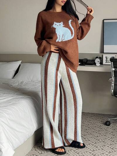 2pcs Women Cat & Striped Pattern Loose Long Sleeve Knit Pajama Set, Autumn/Winter, Fall Clothes-61%