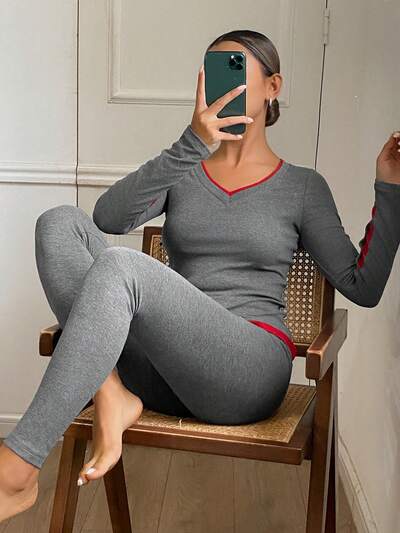 Contrast Color Trim Knit Women Pajama Set-60%