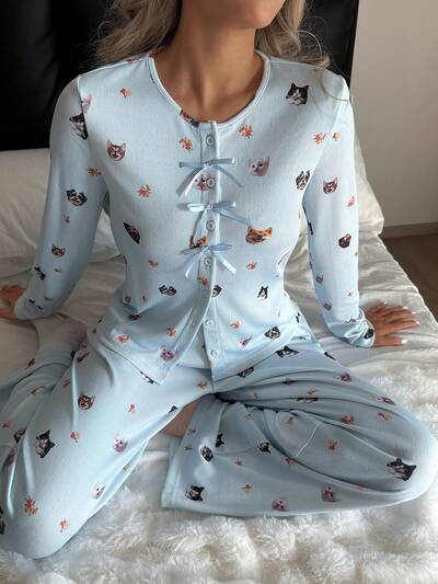 Cute Bow Decor Cat & Dog Print Women Pajama Set-60%