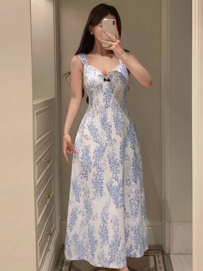 Plant Pattern Full Print Cinched Waist Long Slip Dress For Women-66%
