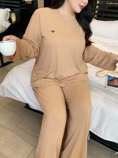 Dazy Plus 2pcs Plus Size Women Heart Print Loose Fit Pajama Set, Casual Homewear For Spring & Autumn Fall Winter Clothes-35%