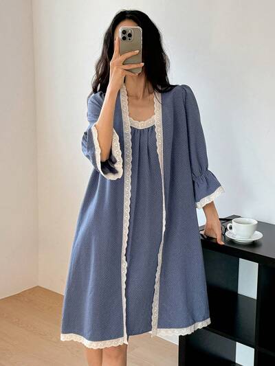 Women's Polka Dot Print Contrast Color Embroidered Lace Patchwork Robe & Camisole Nightgown Sleepwear Set-18%