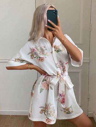 Floral All Over Print Cinched Waist Women's Jumpsuit Sleepwear Pajama-62%
