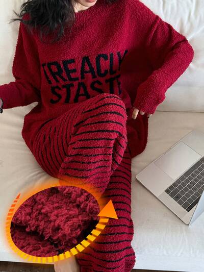 Women's Plush Letter Jacquard Knit Top And Striped Jacquard Pajama Pants Set, Winter-55%