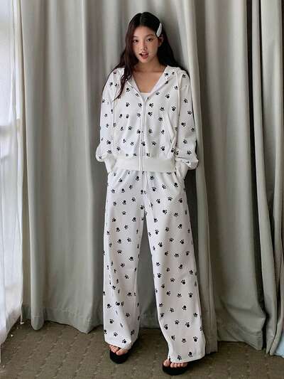 Women's Paw Print Knit Fabric Sweatshirt Pajama Set, Autumn/Winter-55%