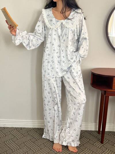 2pcs Women Cute Cat Print Lace Patchwork Long Sleeve Top And Loose Pants Pajama Set, Spring-41%